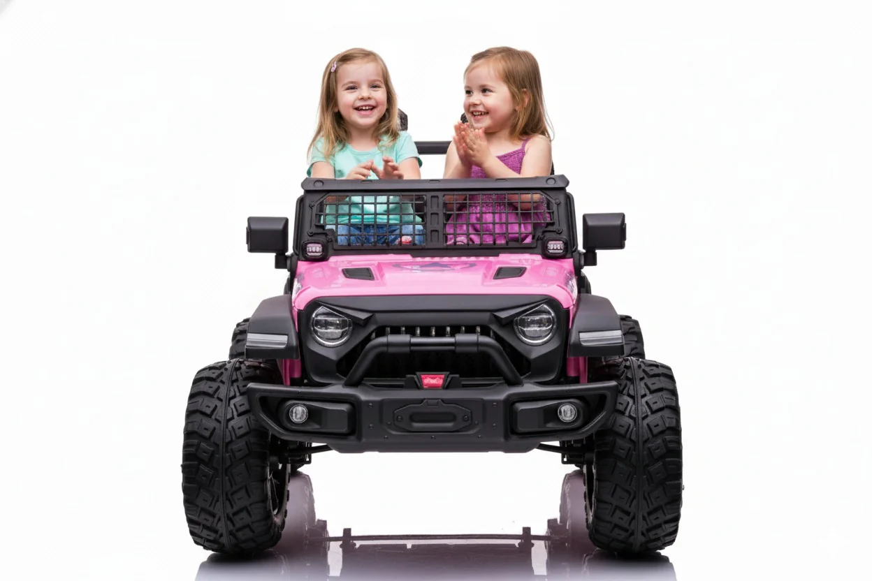 Buy today and you will receive the 4 wheel drive power (1 huge 24 volt motor for each wheel), 4 wheel real rubber tire upgrade, real leather seats, and working suspension for free! Conquer grass, street, rocks, snow, and more. A successful child uses their imagination when playing. What better way for your child to dream up big adventures than by driving their very own 2 Seater Big Wheel style Truck! Magic Cars* Battery Powered Big Wheel style ride will provide your child with years of awesome playtime fun! With enough muscle to be ready for any terrain, Magic Cars* Truck drives on pavement, dirt, grass and gravel – even snow! Perfect for Children 1 – 11 years oldHolds up to 220 pounds. Working suspension.Easy to operateKids can drive themselves, or parents can control with Magic Cars* Wireless Remote ControlExtremely durableChoose your body paint color from Red, White, Black, Green, Blue, or PinkMagic Cars* Big Wheel Style Truck brilliant features: dashboard, working stereo, 4-wheel drive, steering wheel and switches all detailed to duplicate full size. Rubber tires, (4) 24V motors provide plenty of power for hilly inclines, full function power steering allows your child to drive forward, backwards, left and right, functional front and rear lights with on/off switch, real functional doors, one adjustable seat belt, high and low speed setting, plays music at your command, real working FM radio with full volume control and mp3 media player with USB/SD card interface, horn and car start-up sounds, available in red, green and white.The best part is Kids can drive themselves, or Parents can control with Magic Cars* Wireless Remote Control. For child/parental safety, Magic Cars* includes with every car purchase a remote-control unit equipped with wireless command switches. Whether you just want to have fun driving the vehicle with your child inside it, or for children too young to drive the vehicle themselves, right from your hand, your remote-control gives you full control of the car’s movements going forward, backwards, making left or right turns and stopping. To allow your child to drive by themselves, simply allow them to use the driver controls located inside the vehicle and your child, as the driver, has full control over the wheels and pedal. It’s like getting two vehicles in one!Don’t be fooled by imitators. Only official Magic Cars* come with FREE “Best in Class” 1-year bumper to bumper warranty.Watch our official Magic Cars* video to see how easy and how much fun it is to navigate and drive. It’s no secret every dad who’s a truck fanatic will wish he had one when he was a child.Educators say the best learning tools should be fun. Learning the basics of how to drive with Magic Cars* offers children hours of fun while teaching important spatial skills essential for kindergarten readiness. Kindergartners are expected to know how to follow directions and know where their body is in space. Playing and driving helps to build your child’s sense of position, direction, and movement. Learning crucial spatial developmental benefits along with strengthening hand-eye coordination is all part of the fun of driving Magic Cars.*Magic Cars* Battery Powered Electric Ride Big Wheel Truck Specifications and Features: Measures About 5 Feet Long & 3 Feet WideWeighs about 85 lbs.Great for Children 1 – 11 years oldHolds up to 220 lbs.Easy to operate and extremely durableFull function steering allows your child to drive forward, reverse, turn left and rightChoose your body paint color from Red, White, Black, or PinkFour 24V Motors (1 for each wheel)2 Speed selections. Reach Speeds Up to 10 MPHRechargeable Battery pack included110V Charger included2.4GHZ Remote Control includedLighted Instrument PanelFoot Pedal Accelerator2 Seater W/Leather SeatAdjustable Seat BeltWorking DoorsFM radio, MP3 Media Player with USB/SD card interface,Functional Front and Rear Headlights with On/Off SwitchHorn and Start-Up Car SoundsMagic Cars* “Best in Class” 1 Year Bumper to Bumper Warranty IncludedArrives Mostly Assembled. Minor Assembly RequiredReal Rubber TiresDo Not be Fooled by Imitators. Only Magic Cars* has FREE “Best in Class” 1 year Bumper to Bumper Warranty.